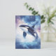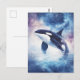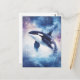 This ethereal postcard features a majestic orca whale leaping gracefully through a dreamlike atmosphere. The killer whale's body is beautifully textured with deep blue and indigo watercolor, speckled with a shimmering field of white stars. Above, a vibrant purple and blue galaxy swirl is filled with brilliant stars and nebulae, while the whale emerges from misty, light blue waters below. The soft-focus background and magical lighting create a powerful sense of wonder and celestial beauty. This postcard is an ideal choice for sending an inspirational message, a thoughtful note to a marine life lover, or for use as a piece of dreamy, nature-inspired wall decor.