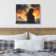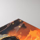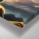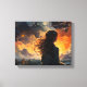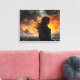 Ein junges Mädchen blickt auf einen hellorangen Sonnenuntergang, der einen Sternenhimmel in Brand setzt. Wolken rollen über den Horizont über eine fantastische Stadt mit Brücken, Türmen und beleuchteten Fenstern. Das Mädchen sitzt auf einem felsigen Hügel mit ihrem Rücken zum Betrachter, ihr braunes Haar weht im Wind. Die Bewegung in diesem Bild ist verführerisch, und eine Person kann nicht anders, als sich ihre Geschichte vorzustellen.