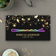 Elegante Friseurkarte mit wunderschönen Goldsternenkonfetti und Imitaten goldene Folienakzente auf schwarzem Hintergrund. Fügen Sie Ihren Namen und Ihre Kontaktdaten hinzu, um einen bleibenden ersten Eindruck zu machen.