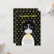 Pajama Birthday Party Einladungskarte mit einer hübschen Tuxedo Katze als Messenger und gelben Sternen auf schwarzem Hintergrund. Alle Texte sind personalisiert.