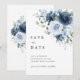 Elegante staubblaue und marineblaue Wasserfarben-Blumen-Save-the-Date-Karte mit einem raffinierten Blumenstrauß, klassischen Serifen-Details und einer weichen, romantischen Blaupalette. Für Paare konzipiert, die einen eleganten, zeitlosen ersten Eindruck hinterlassen möchten, kombiniert dieses Layout moderne, minimalistische Abstände mit malerischen Blumen für ein schönes, ausgewogenes Aussehen.