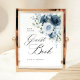 Erhöhen Sie Ihre Hochzeitsdekoration mit diesem staubblauen und navyblauen floralen Gästebuch-Schild, entworfen in einem eleganten feinkünstlerischen Aquarell-Stil. Perfekt für klassische, moderne und Gartenhochzeiten, führt dieses Tischschild die Gäste schön und verbindet die Details Ihres Tages. Alle Texteingaben sind in den Textfeldern editierbar; Aquarell-Kunstwerk und Layout bleiben wie abgebildet.