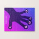 Stay weird psychedelic puzzle with a trippy digital illustration of a dark palm with fingers ending in eyeballs with pink irises and strange white eyelashes watching you over purple background.