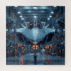 Cinematic Front View eines futuristischen Stealth Jets, das von Roboter-Montagearmen in einem leuchtenden industriellen Hangar gehalten wird. Blaue Stahltöne, bernsteinfarbene Lichter und knusprige Details schaffen eine dramatische Szene, die zum Bauen einlädt und auffällig zu sehen ist. Perfektes Geschenk für Flieger, Mecha-Fans und Gamer. Wählen Sie Ihre gewünschte Größe und Stückzahl auf Zazzle.