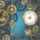Türkis, strukturiert, Steampunkhintergrund mit Messing- und Goldgetrieben, Silberschlüssel und Uhr. Steampunkstil.