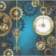 Türkis, strukturiert, Steampunkhintergrund mit Messing- und Goldgetrieben, Silberschlüssel und Uhr. Steampunkstil.