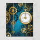 Türkis, strukturiert, Steampunkhintergrund mit Messing- und Goldgetrieben, Silberschlüssel und Uhr. Steampunkstil.