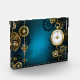 Türkis, strukturiert, Steampunkhintergrund mit Messing- und Goldgetrieben, Silberschlüssel und Uhr. Steampunkstil.