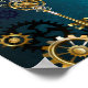 Türkis, strukturiert, Steampunkhintergrund mit Messing- und Goldgetrieben, Silberschlüssel und Uhr. Steampunkstil.