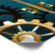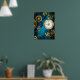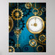 Türkis, strukturiert, Steampunkhintergrund mit Messing- und Goldgetrieben, Silberschlüssel und Uhr. Steampunkstil.