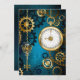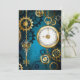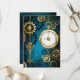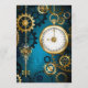 Türkis, strukturiert, Steampunkhintergrund mit Messing- und Goldgetrieben, Silberschlüssel und Uhr. Steampunkstil.