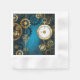 Türkis, strukturiert, Steampunkhintergrund mit Messing- und Goldgetrieben, Silberschlüssel und Uhr. Steampunkstil.