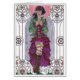 Steampunkerin mit bordeauxrosa Rock, grüner Jacke, Hut und gestreiften Leggings. Der weiße Hintergrund mit Gängen ist vor allem durch eine graue Tür und eine pachy-rosa Sonne gekennzeichnet.