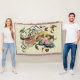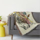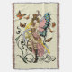 Eine blonde Steampunk-Fee mit rosa und blauen Flügeln. Die Fee trägt niedliches Outfit mit einem Top-Hut, Korsett und gestreiften Strümpfen, Schmetterlingen, Uhr, Gängen und Stammesdesign im hellgelben Hintergrund