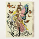 Eine blonde Steampunk-Fee mit rosa und blauen Flügeln. Die Fee trägt niedliches Outfit mit einem Top-Hut, Korsett und gestreiften Strümpfen, Schmetterlingen, Uhr, Gängen und Stammesdesign im hellgelben Hintergrund