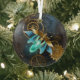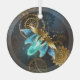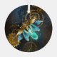 Steampunk glänzt mit blauen, transparenten Flügeln und grüner Glühbirne auf abgenutztem, braunem, strukturiertem Hintergrund. Steampunkstil.
