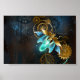 Steampunk glänzt mit blauen, transparenten Flügeln und grüner Glühbirne auf abgenutztem, braunem, strukturiertem Hintergrund. Steampunkstil.