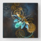 Steampunk glänzt mit blauen, transparenten Flügeln und grüner Glühbirne auf abgenutztem, braunem, strukturiertem Hintergrund. Steampunkstil.