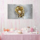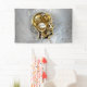 Konzeptioneller, mechanischer, menschlicher Kopf mit antiken Manometer und Metallgetriebe vor grauem industriellem Hintergrund. Steampunkstil.