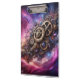 Dieses lebendige Steampunker-Fantasy-Uhrwerk entwirft in rosa und lila Strahlen über einen sternfüllten Nebel im Nachthimmel.