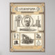 Steampunkposter im Retro-Stil mit einem Wissenschaftler, Viktorianischen Modeartikeln und verschiedenen Erfindungen wie Maschinen, Apparate, Getriebe, einem starren, Edison-Glühbirnen und einem lustigen Fahrzeug / locomobile, DIN-Format