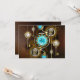 Türkisfarbene Linsen mit antiker Uhr mit Messinggetrieben und goldenen Tasten auf rostigem, braunem Hintergrund. Steampunkstil.