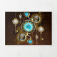 Türkisfarbene Linsen mit antiker Uhr mit Messinggetrieben und goldenen Tasten auf rostigem, braunem Hintergrund. Steampunkstil.