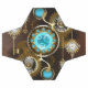 Türkisfarbene Linsen mit antiker Uhr mit Messinggetrieben und goldenen Tasten auf rostigem, braunem Hintergrund. Steampunkstil.