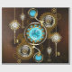 Türkisfarbene Linsen mit antiker Uhr mit Messinggetrieben und goldenen Tasten auf rostigem, braunem Hintergrund. Steampunkstil.