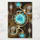 Türkisfarbene Linsen mit antiker Uhr mit Messinggetrieben und goldenen Tasten auf rostigem, braunem Hintergrund. Steampunkstil.