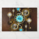 Türkisfarbene Linsen mit antiker Uhr mit Messinggetrieben und goldenen Tasten auf rostigem, braunem Hintergrund. Steampunkstil.
