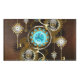 Türkisfarbene Linsen mit antiker Uhr mit Messinggetrieben und goldenen Tasten auf rostigem, braunem Hintergrund. Steampunkstil.
