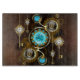 Türkisfarbene Linsen mit antiker Uhr mit Messinggetrieben und goldenen Tasten auf rostigem, braunem Hintergrund. Steampunkstil.