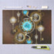Türkisfarbene Linsen mit antiker Uhr mit Messinggetrieben und goldenen Tasten auf rostigem, braunem Hintergrund. Steampunkstil.