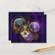 Steampunkspinne aus Gold und Stahl mit antiken Uhren mit vergoldeten Gängen auf lila, gestreiftem, texturiertem Hintergrund mit Linsen und Messinggetrieben. Steampunkstil.