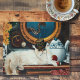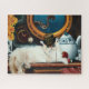 Weiße Furry Steampunk Katze mit seinem niedlichen braunen Hut und seiner Brille. Die Katze sitzt auf einer Theke oben in der Schiffsküche, gewartet für seine Teezeit. Hinter ihm liegt das Schiffsfenster, an dem ein Oktopus vorbeikommt.