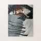 Steampunk Viktorianische Rothaarin auf einem Winterspaziergang, die ihren Libellenchefs mit einem Schlüssel freigibt.