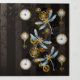 Antike Tasten mit Gold- und Messinggetrieben, mit mechanischen Steampunkdrachenfliegen auf braunem, gestreiften Hintergrund dekoriert.