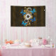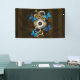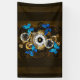 Zusammensetzung des runden Steampunkuhrs mit schwarz römischer Ziffernscheibe, mit Gold- und Messinggetrieben, blauen Morpho-Schmetterlingen und beschädigten Linsen auf braunem gestreiftem Hintergrund. Steampunkstil.