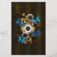 Zusammensetzung des runden Steampunkuhrs mit schwarz römischer Ziffernscheibe, mit Gold- und Messinggetrieben, blauen Morpho-Schmetterlingen und beschädigten Linsen auf braunem gestreiftem Hintergrund. Steampunkstil.