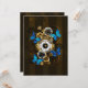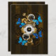 Zusammensetzung des runden Steampunkuhrs mit schwarz römischer Ziffernscheibe, mit Gold- und Messinggetrieben, blauen Morpho-Schmetterlingen und beschädigten Linsen auf braunem gestreiftem Hintergrund. Steampunkstil.
