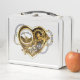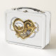 Mechanisches, volumetrisches, steampunktes Herz mit Druckmesser, Stahl- und Goldgetrieben auf weißem Hintergrund. Steampunkstil.