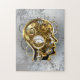 Konzeptioneller, mechanischer, menschlicher Kopf mit antiken Manometer und Metallgetrieben vor grauem industriellem Hintergrund. Steampunkstil.