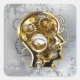 Konzeptioneller, mechanischer, menschlicher Kopf mit antiken Manometer und Metallgetrieben vor grauem industriellem Hintergrund. Steampunkstil.