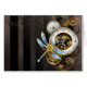 Antiquitätendiale mit Gold- und Messinggetrieben, mit mechanischer Libelle auf braunem, gestreiftem Hintergrund dekoriert. Steampunk.