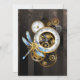 Antiquitätendiale mit Gold- und Messinggetrieben, mit mechanischer Libelle auf braunem, gestreiftem Hintergrund dekoriert. Steampunk.