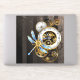 Antiquitätendiale mit Gold- und Messinggetrieben, mit mechanischer Libelle auf braunem, gestreiftem Hintergrund dekoriert. Steampunk.