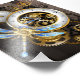 Antiquitätendiale mit Gold- und Messinggetrieben, mit mechanischer Libelle auf braunem, gestreiftem Hintergrund dekoriert. Steampunk.