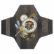 Antiquitätendiale mit Gold- und Messinggetrieben, mit mechanischer Libelle auf braunem, gestreiftem Hintergrund dekoriert. Steampunk.