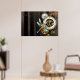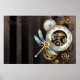 Antiquitätendiale mit Gold- und Messinggetrieben, mit mechanischer Libelle auf braunem, gestreiftem Hintergrund dekoriert. Steampunk.
